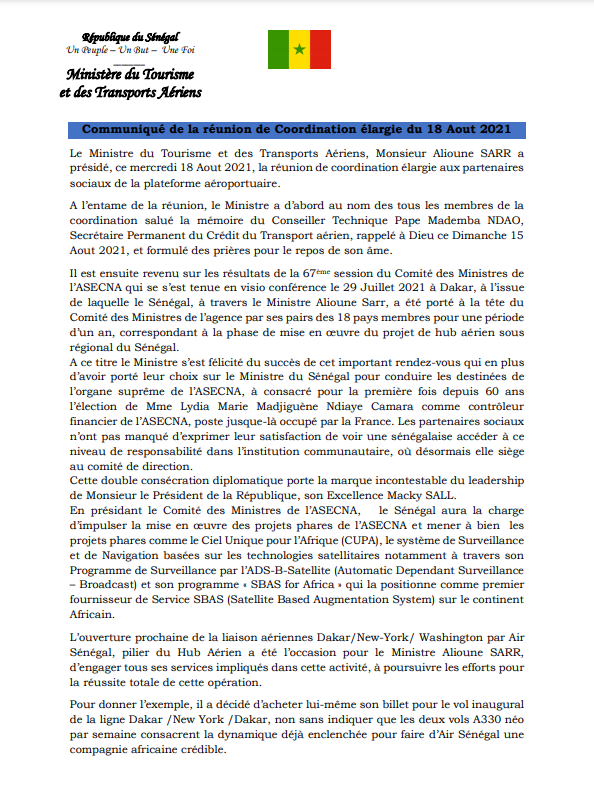 de cette rencontre, le Sénégal a été porté à la tête du Comité des Ministres de l’agence par les 18 pays membres pour une période d’une an, correspondant à la phase de mise en œuvre du projet de hub aérien sous régional du Sénégal.