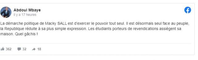 Le leader de l’Alliance pour la citoyenneté et le travail (ACT), Abdoul Mbaye s’est exprimé sur la tournée économique du Chef de l’Etat Macky Sall. Dans un post sur sa page Facebook, l’ancien premier ministre pense que la démarche politique que mène actuellement le Président Macky Sall consiste à exercer le pouvoir tout seul.