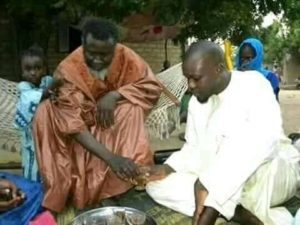 Dans cette photo, il s’agit du marabout Baye fall, petit-fils de Mame Cheikh Ibrahima Fall, Serigne Cheikh Fall Mbaor que vous apercevez servant du thé au leader de Pastef Ousmane Sonko.