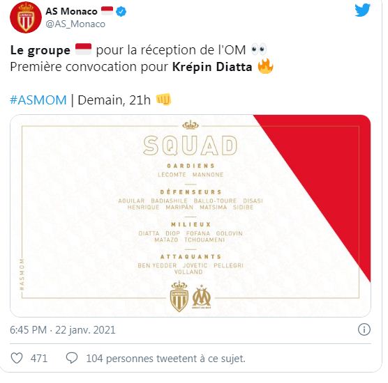Pour le derby méditerranéen face à l’Olympique de Marseille, prévu ce samedi soir (20 heures, au Stade Louis-II) dans le cadre de la 21ème journée de Ligue 1, Niko Kovac, l’entraîneur de l’AS Monaco, a fait appel à un groupe élargi de 20 joueurs. Krepin Diatta, nouvelle recrue des monégasques, est bien là. L’international sénégalais a signé hier au Rocher jusqu’en juin 2025.