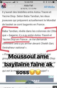 Bagarre avec Astou Traoré, Yacine Diop dément Baba Tandian Buzz By Cheikh Tidiane Toure On Sep 18, 2018 0 35 Partage astou traorébaba tandianbagarrebasketyacine diop 0 35 Partage