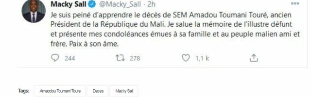 « Je suis peiné d’apprendre le décès de SEM Amadou Touma Touré, ancien président de la République du Mali. Je salue la mémoire de l’illustre défunt et présente mes condoléances émues à sa famille et au peuple malien ami et frère. Paix a son âme », a écrit le Chef de l’Etat dans un tweet.