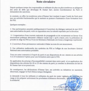 Me Abdoulaye Wade a rendu publique vendredi une note circulaire relative au constat de nombreux actes de Oumar Sarr, ancien coordonnateur du Pds, tendant à saper l’unité du parti ainsi que ses activités fractionnelles qui le mettent en dehors du parti. Toutes choses qui font que le Secrétaire général national du Pds dit constater la démission de fait de Oumar Sarr et prendre acte.