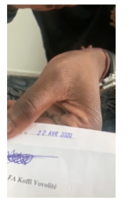 « Quant au certificat médical qu’il a brandi, il date du 22 avril 2020 après un test réalisé le 20 Mars 2020…au Togo.Si on regarde bien cette vidéo, Khalilou Fadiga a pris soin de cacher avec son doigt le lieu de délivrance de ce fameux document. Malheureusement pour lui, il n’a pas pu cacher le nom du médecin qui a délivré ce document (Ndlr : voir capture d’écran), le Dr Agbetiafa Koffi Vovolité, Directeur du District Sanitaire Numéro 1 de la Région Lomé Commune, par ailleurs membre de « solidar’sante », organisme à but non lucratif créé en 2013 en Belgique…