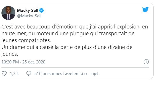 Le Président de la République s’est fendu d’un tweet, dimanche, pour exprimer son “émotion” suite à l’explosion, en haute mer, du moteur d’une pirogue qui transportait des migrants clandestins. Macky Sall déplore la perte de plus d’une dizaine de jeunes.