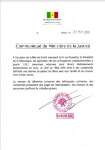 À l’occasion de la fête de l’Eid El Fidr qui va être célébrée dans les prochaines 48 heures, le chef de l’Etat Macky Sall a gracié ce vendredi 22 mai 2020 1021 détenus incarcérés pour divers délits.