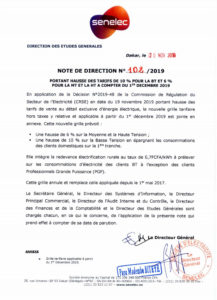 Une hausse de 6% sur la Moyenne et la haute tension et une hausse de 10% sur la Basse tension en épargnant les consommateurs des clients domestiques sur la 1ere tranche vont entrer en vigueur à compter du 1er décembre. La Senelec annonce une « nouvelle grille tarifaire hors taxes » à partir de cette date en application de la Décision N°2019-48 de la Commission nationale de régulation de l’électricité en date du 19 nombre 2019 « portant hausse des tarifs de vente au détail exclusive d’énergie électrique ». Voici la nouvelle grille tarifaire