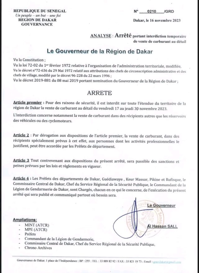 Pour des raisons de sécurité : il est interdit sur toute l’étendue du territoire de la région de Dakar la vente de carburant au détail du vendredi 17 au jeudi 30 novembre 2023.