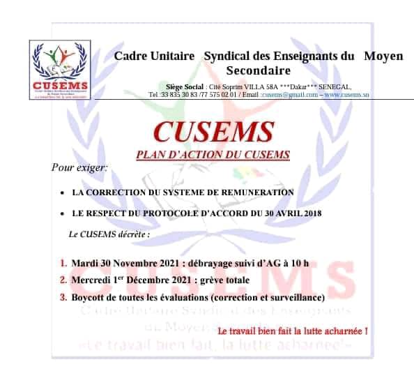 Le Cadre unitaire Syndical des enseignants du moyen-secondaire (CUSEMS) a annoncé un débrayage le mardi 30 novembre 2021 suivi d’une grève générale le 1er décembre. Ces enseignants comptent boycotter toutes les évaluations, comme les corrections et les surveillances des évaluations.