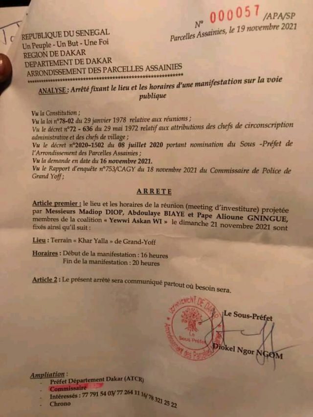 Le meeting d’investiture projeté par les membres de la coalition “Yewwi Askan Wi”, le dimanche 21 novembre 2021, aura lieu au Terrain “Khar Yalla” de Grand-Yoff, indique l’arrêté.