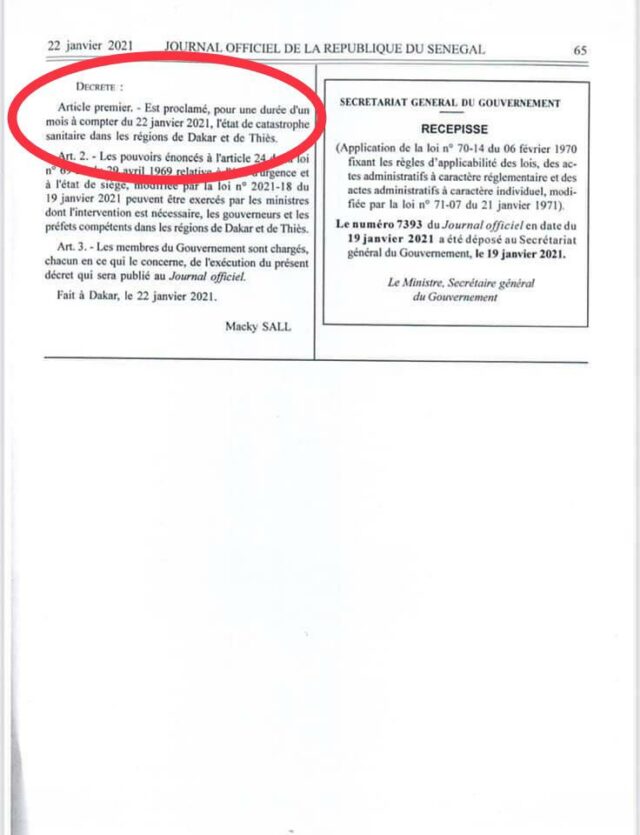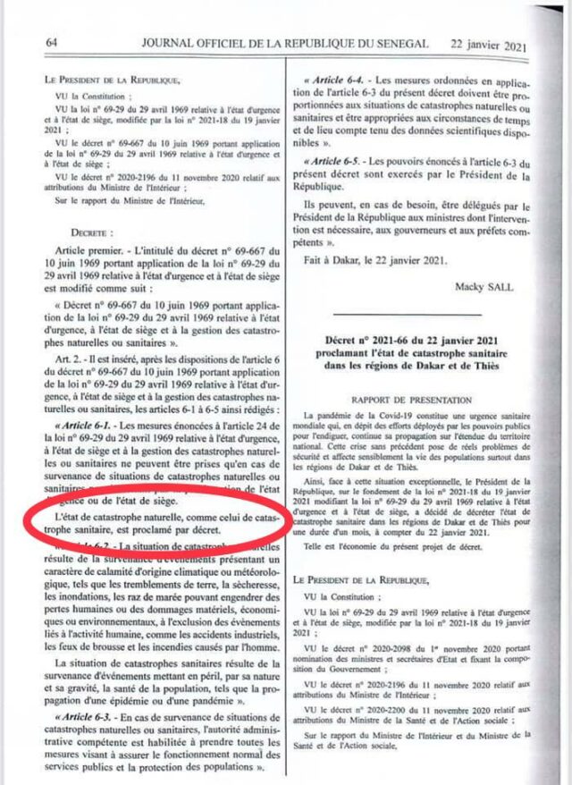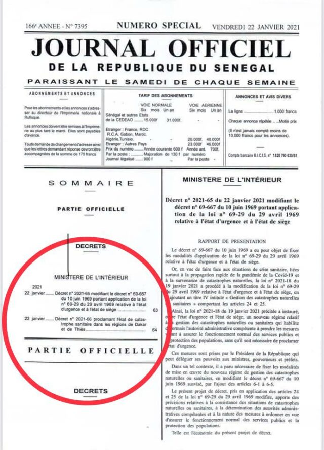 Ainsi, la proclamation de l’état d’urgence sanitaire tiendrait sa légalité du décret 2021-65 modifiant le décret 69-667 du juin 1969 portant application de la loi n° 69-29 du 29 Avril 1969 relative à l’état d’urgence et à l’état de siège.