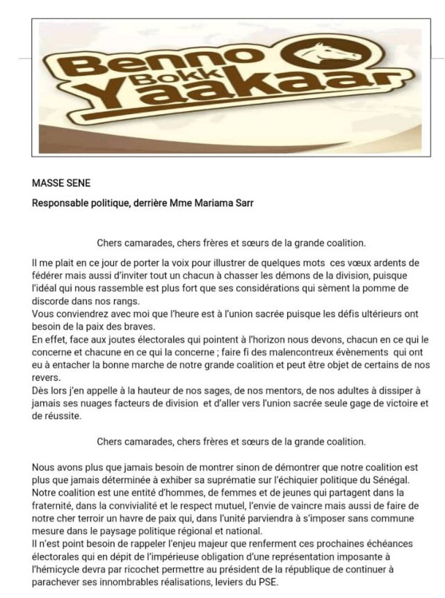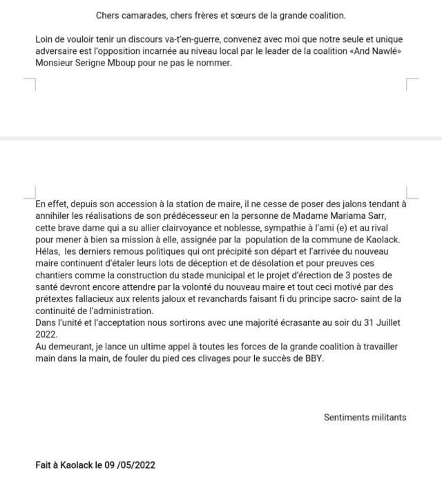 Loin de vouloir tenir un discours va-t’en-guerre, convenez avec moi que notre seule et unique adversaire est l’opposition incarnée au niveau local par le leader de la coalition « And Nawlé » Monsieur Serigne Mboup pour ne pas le nommer.