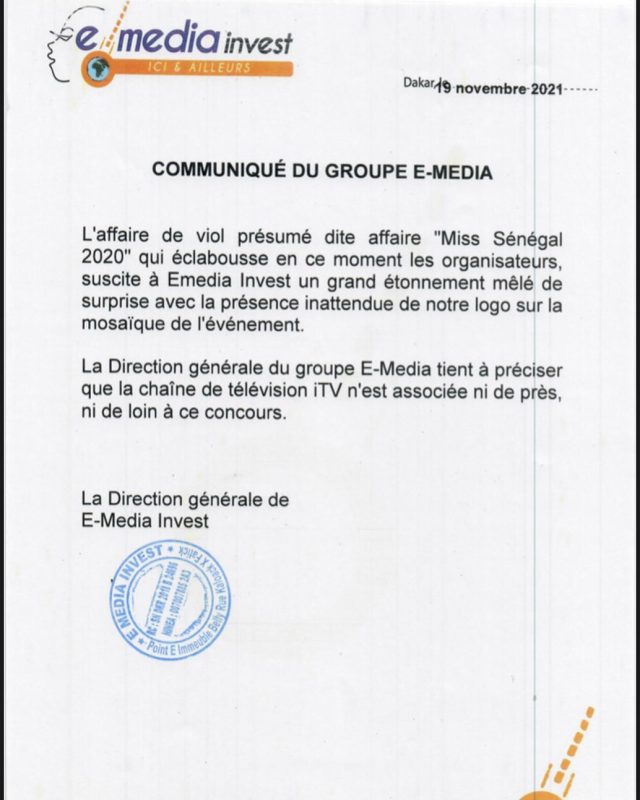 « L’affaire de viol présumé dite affaire « Miss Sénégal 2020 » qui éclabousse en ce moment les organisateurs, suscite à Emedia Invest un grand étonnement mêlé de surprise avec la présence inattendue de notre logo sur la mosaïque de l’événement.