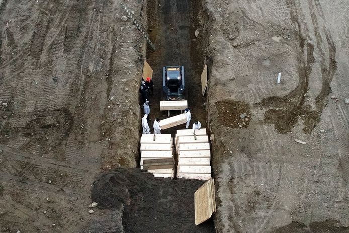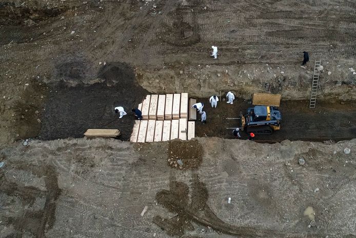 Des images prises par un drone montrent des travailleurs mettre des cercueils dans des tranchées sur Hart Island. 25 corps sont enterrés chaque jour pour l’instant, cinq jours par semaine. Jeudi, 40 cercueils ont été alignés et deux nouvelles tranchées ont été creusées.