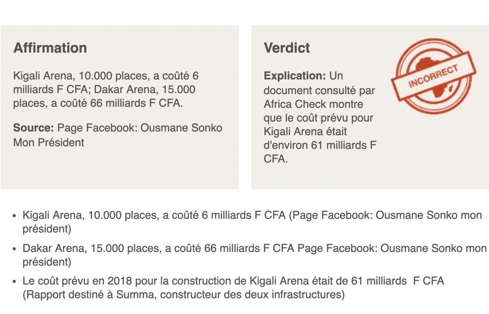 Sur le visuel on peut lire : « Kigali Arena, 10.000 places, coût 6 milliards F CFA ; Dakar Arena, 15.000 places, coût 66 milliards ; Trouvons l’erreur ; différence de 5.000 places, différence de 60 milliards de F CFA ».