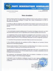 « L’alliance Suqali Soppi qui est un cadre d’échanges et de réflexions politiques, qui réunit des militants du PDS, considère que le contenu de la note circulaire n°0087/SGN/PDS/2019 du 21 novembre 2019 n’a aucune base légale au regard des dispositions des statuts et du règlement intérieur du PDS. C’est une énième forfaiture que Karim Wade fait commettre à Me Abdoulaye Wade. A cet effet, l’Alliance Suqali Soppi convoque ce dimanche 24 Novembre 2019, le directoire provisoire pour analyser la situation et prendre les décisions idoines« , conclut le Directoire Provisoire de Alliance Suqali Soppi.
