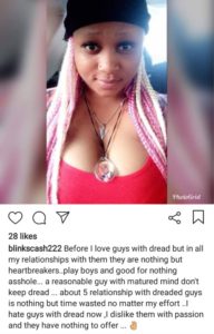 Cette femme avec pour pseudo Blinkscash sur Instagram, a récemment fait des reproches aux hommes qui portent des dreadlocks, sur sa page. Elle révèle qu’elle est a été dans une relation amoureuse avec cinq hommes aux dreadlocks jusqu’à présent et cela s’est toujours soldé par une rupture.