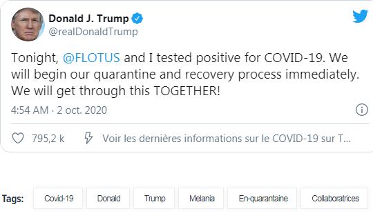 « Ce soir, (la première dame) et moi avons été testés positifs au COVID-19. Nous allons entamer notre quarantaine et notre processus de guérison immédiatement. Nous allons nous en sortir ENSEMBLE! », a tweeté le locataire de la Maison Blanche ce vendredi.