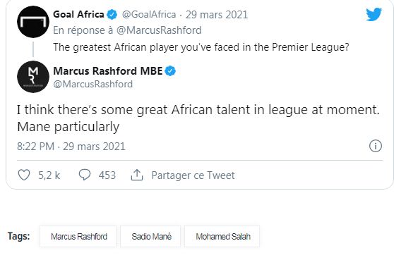 Marcus Rashford ne tarit pas d’éloges sur Sadio Mané. Dans une série de questions-réponses sur la page Twitter du site Goal, l’attaquant de Manchester United a désigné le Sénégalais comme étant le meilleur joueur africain actuellement en Premier League. »Il y’a beaucoup de grands joueurs africains dans le championnat. Particulièrement Mané », a-t-il commenté.