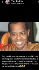Kouthia se souvient de Sidy Lamine Niasse. Sur son statut WhatsApp, le comédien a laissé un message émouvant sous la photo du regretté Pdg de Walfadjri. « Sidy nous manque. Dans cette élection, il n’y a pas de suspense, pas d’émotion, ni d’analyse… Personnellement, je sens ton absence… », confie-t-il, avant de prier pour le repos de son âme.