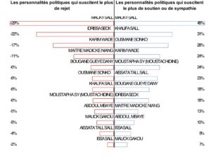 La cote de confiance du Président est à relativiser dans la mesure où il reste également la personnalité politique qui suscite le plus de rejet dans l’opinion publique. En effet, 29% des personnes interrogées gardent une mauvaise opinion de Macky SALL. Il est suivi de ses anciens camarades du PDS notamment Idrissa SECK (22%), Karim WADE (17%) et Maitre Madické NIANG (11%).
