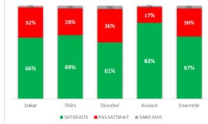 En ce qui concerne globalement le bilan du Président sortant, dans l’ensemble 67% des personnes interrogées jugent le bilan satisfaisant ou plutôt satisfaisant. Cette appréciation est plus forte à Dakar et plus faible dans la région de Diourbel.