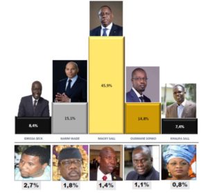 Après ce quinté de tête, on retrouve des candidats ou partis ayant moins d’envergure tels que Bougane Gueye Dany avec 2,7% et le PUR (Moustapha sy et Issa Sall) avec 3,2% des intentions.