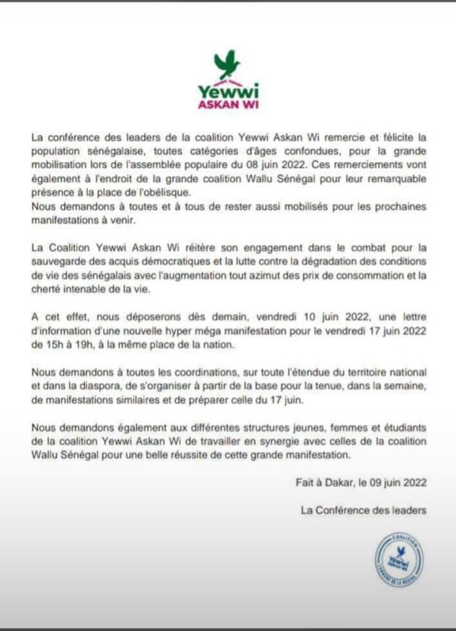 « La conférence des leaders de la coalition Yewwi Askan Wi, après avoir remercié et félicité la population sénégalaise pour la grande mobilisation lors de l’assemblée populaire d’hier, entend déposer ce vendredi 10 juin 2022, une lettre d’information d’une nouvelle hyper méga manifestation pour le vendredi 17 juin 2022 de 15h à 19h, à la même place de la nation », lit-on.